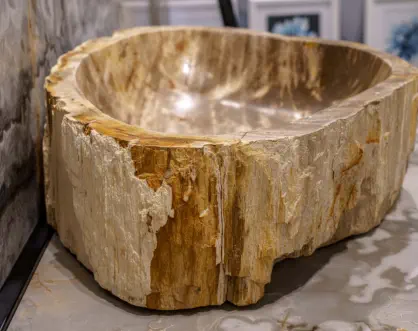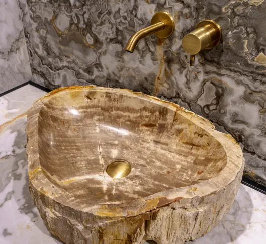 Namizni umivalnik, izdelan iz dela okamenelega drevesa.